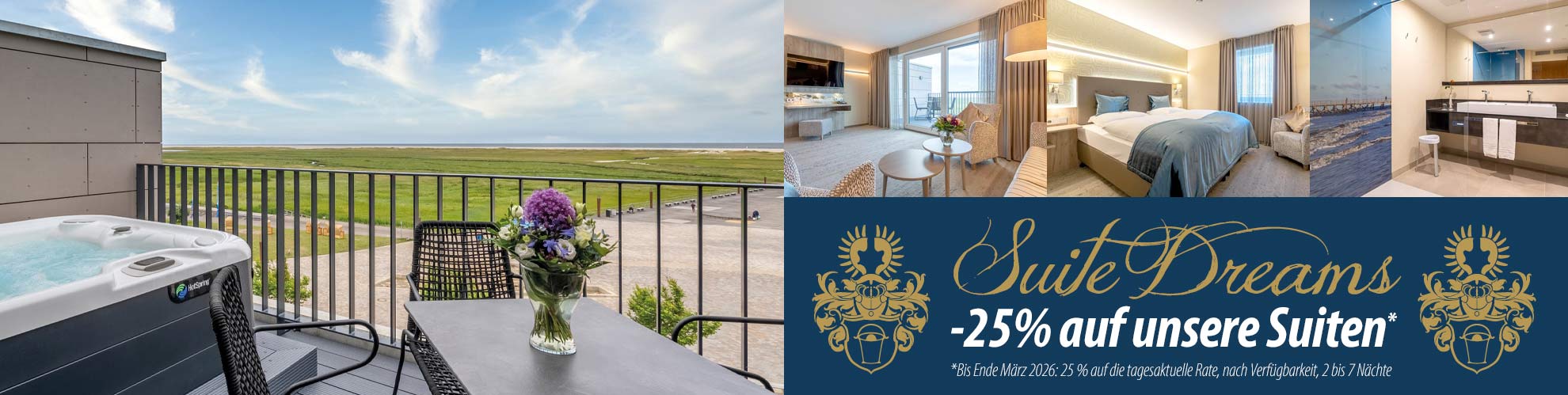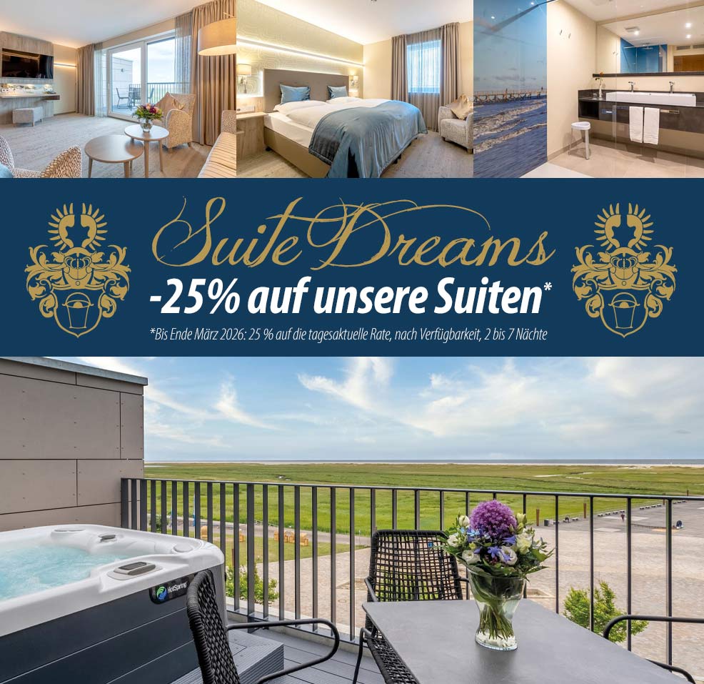 Beste Aussichten für Ihre Ferien in St. Peter-Ording: Verbringen Sie Ihren Nordsee-Urlaub in stilvollen Zimmern und Suiten unseres Hotels der Kategorie 4 Sterne Superior. Erholen Sie sich in bester Lage direkt an der neu gestalteten Strandpromenade mit freiem Blick auf Salzwiesen, Strand und Wattenmeer.